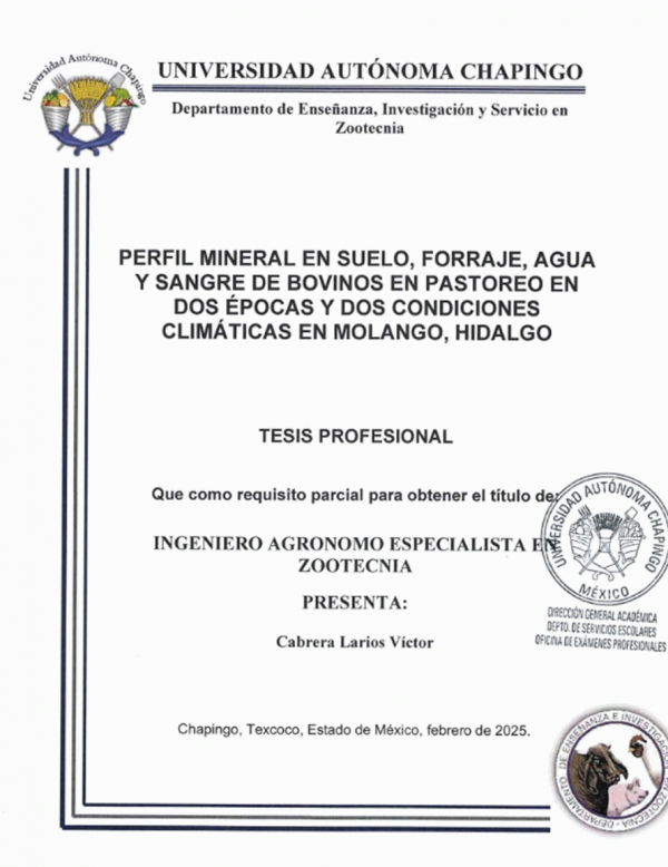 Subject(s): Online resources: Dissertation note: Ingeniero Agrónomo Especialista en Fitotecnia Departamento de Enseñanza, Investigación y Servicio en Zootecnia, 2024. Licenciatura Summary: El objetivo del estudio fue determinar el contenido de calcio (Ca), fósforo (P), magnesio (Mg), potasio (K), sodio (Na), iodo (I), cobalto (Co), cobre (Cu), zinc (Zn) y selenio (Se) en muestras de forraje, suelo, agua y sangre de bovinos en pastoreo de dos Sitios con condiciones climáticas distintas (clima templado y cálido), en época seca y lluviosa en Molango, Hidalgo. En cada Sitio se estableció una estación meteorológica para medir datos de precipitación y temperatura. Se colectaron tres repeticiones por muestra de forraje, suelo, agua y sangre de bovinos (hembras adultas). Los análisis minerales se realizaron mediante un equipo espectroscopía de emisión atómica de inducción por plasma acoplado 8 Agilent, ICP OES (Optical Emission Spectrometer, 725-ES, EE.UU). El contenido mineral en forraje, suero sanguíneo y agua presentó diferencias (p<0.05) entre épocas, en suelo las concentraciones de Ca, Mg, P, K, Cu, Fe y Se fueron semejantes (p>0.05) en épocas, en suero sanguíneo la concentración de P, Mg, K, Na, Cu, Fe y Zn fue mayor en los bovinos del Sitio 2 (p<0.05). Los forrajes de ambos Sitios fueron deficientes para satisfacer el mínimo requerimiento en bovinos en Mg, Cu, en el Sitio 1, Zn fue deficiente en ambas épocas. En la época seca las concentraciones de Ca, P, Mg, I y Fe fueron menores respecto a la época lluviosa (p<0.05). Las concentraciones de Na, Se y Zn fueron menores en la época seca. La concentración de Cu, Se y Zn en suero sanguíneo fue deficiente, las concentraciones de P, Mg, Na, Cu, Fe, Se y Zn fueron mayores en el suero sanguíneo de los animales del Sitio 2 (p<0.05), mientras que en el Sitio 1 la concentración de Ca en suero sanguíneo fue mayor(p<0.05). El tipo de suelo, pH y las variables climáticas influyeron en la absorción y disponibilidad de nutrientes en ambas épocas del año afectando la interacción suelo-planta-animal, disminuyendo la capacidad reproductiva de los bovinos.