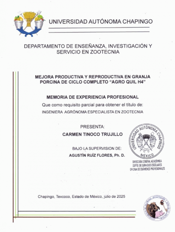 Mejora productiva y reproductiva en granja porcina de ciclo completo Agro Quil H4 / por Carmen Tinoco Trujillo; director de tesis Agustín Ruíz Flores; secretario Constantino Romero Márquez; vocal José Guadalupe Martínez Martínez; suplente Alejandro Lara Bueno; suplente Ricardo Emmanuel Martínez Rocha.