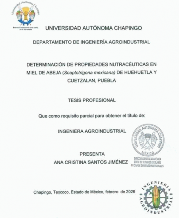 Stingless Bee Honey has been valued since pre-Hispanic times for its medicinal uses (Márquez Luna, 1994). The Maya used it to treat eye cataracts and whooping cough, while in communities such as Huehuetla and Cuetzalan, Puebla, it is still used to treat respiratory diseases, ocular cataracts, and to promote wound healing. The objective of this study was to quantitatively characterize the nutraceutical properties of meliponine bee honey, Scaptotrigona mexicana. To this end, five honey samples from Scaptotrigona bees were collected in two municipalities in the northeastern highlands of the state of Puebla. The following propierties were quantified: 1. the honey's ability to inhibit the growth of bacteria and fungi; 2. its antioxidant capacity, using the radicals 2.1) 2,2-diphenyl-1-picrylhydrazyl (DPPH), and 2.2) 2,2-azino-bis (3-ethylbenzothiazoline-6-sulfonic acid) (ABTS); 3. The concentration of phenolic compounds using the Folin-Ciocalteu method; and 4. The chelating activity of a divalent metal using ferrozine. The results indicated that both the meliponine honey to positive control mixture (MM:CP) (75:25) and the pure honey (100:0) from Scaptotrigona mexicana were capable of inhibiting the growth of bacteria, fungi, and yeasts on Petrifilm® 3M plates. In addition, it exhibited remarkable antioxidant capacity, with an average DPPH radical inhibition of 30.43% and ABTS radical inhibition of 33.62%, expressed in milligrams of ascorbic acid equivalents (AAE) per 100 g of honey. The DPPH method yielded values ranging from 118.16 ± 1.33 to 165.88 ± 4.69, and the ABTS method from 90.50 ± 4.46 to 137.21 ± 5.42. The honey concentration required to inhibit 50% of the DPPH free radical activity (IC₅₀) ranged from 27.71 ± 0.50 to 53.91 ± 7.64 mg/mL, whereas for ABTS it ranged from 22.15 ± 1.30 to 48.53 ± 5.31 mg/mL. It also showed an average iron chelating activity of 76.64 ± 1.23%, using EDTA as the reference standard, and a considerable concentration of total phenolic compounds, with an average value of 420.10 ± 8.63 mg gallic acid equivalents (GAE) per 100 g of honey. These findings confirm that Scaptotrigona mexicana honey can be considered a nutraceutical product, according to the definition proposed by Pérez Leonard (2006). Based on these results, scientifically grounded information was generated to be included in a technical sheet that highlights the nutraceutical attributes of meliponine honey. This demonstrates its potential to be marketed as a sustainable and differentiated product, offering added value compared to Apis mellifera honey, for the benefit of the Nahua communities of Cuetzalan and the Totonac communities of Huehuetla, in the Sierra Nororiental region of Puebla.