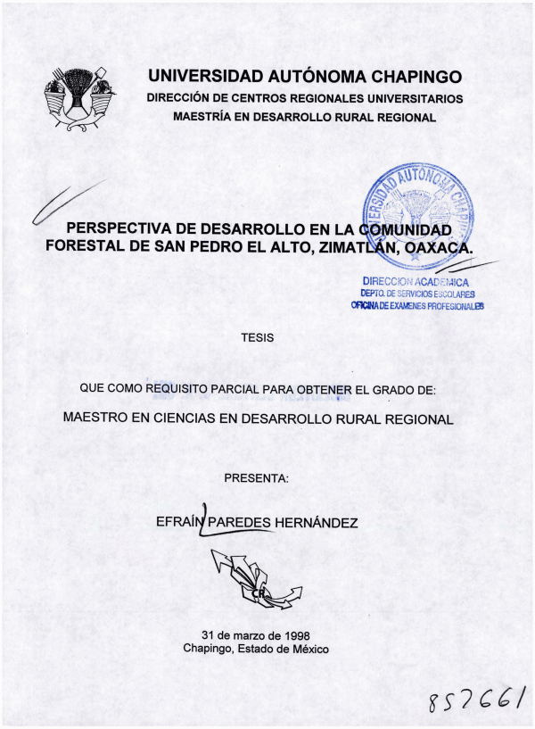 Perspectiva de desarrollo en la comunidad forestal de San Pedro El Alto, Zimatlán, Oaxaca /por Efraín Paredes Hernández