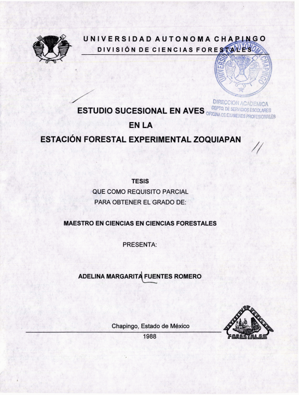 Estudio sucesional en aves en la Estación Forestal Experimental Zoquiapan /por Adelina Margarita Fuentes Romero