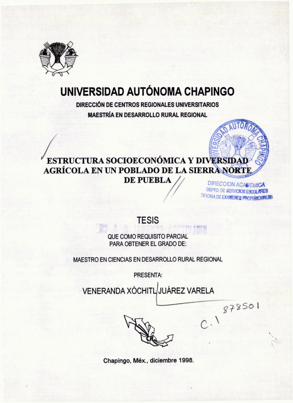Estructura socioeconómica y diversidad agrícola en un poblado de la Sierra Norte de Puebla /por Veneranda Xóchitl Juárez Varela