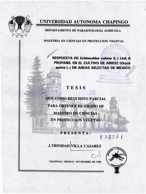 Respuesta de Echinochloa colona (L.) Link a propanil en el cultivo de arroz (Oryza sativa L.) en areas selectas de México /por J. Trinidad Villa Cásarez