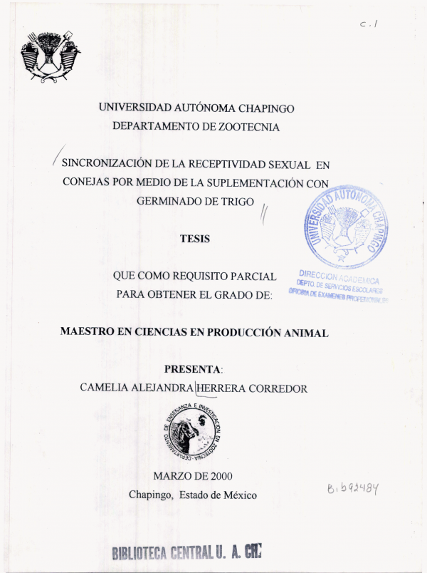 Sincronización de la receptividad sexual en conejas por medio de la suplementación con germinado de trigo /por Camelia Alejandra Herrera Corredor