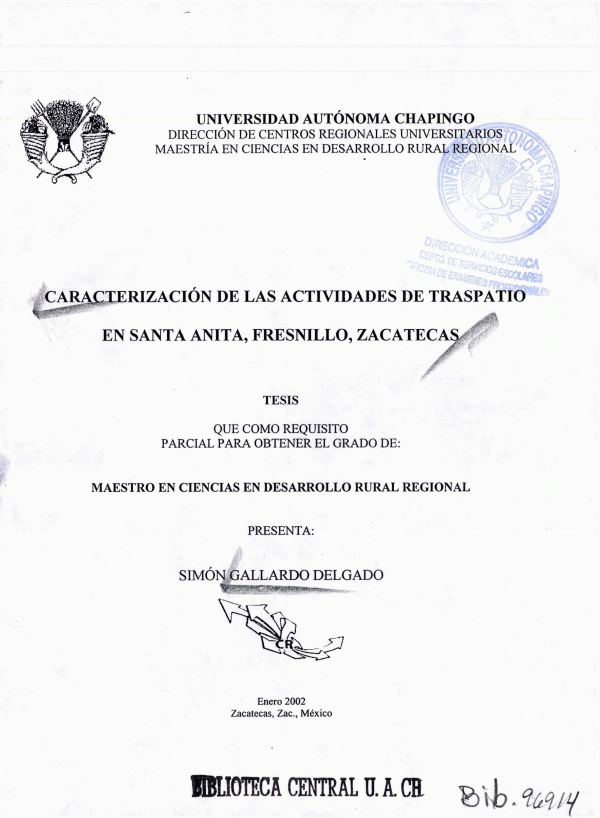 Caracterización de las actividades de traspatio en Santa Anita, Fresnillo, Zacatecas /por Simon Gallardo Delgado