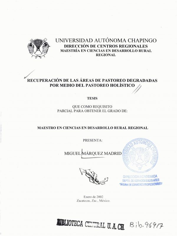 Recuperación de las áreas de pastoreo degradadas por medio del pastoreo holístico /por Miguel Márquez Madrid
