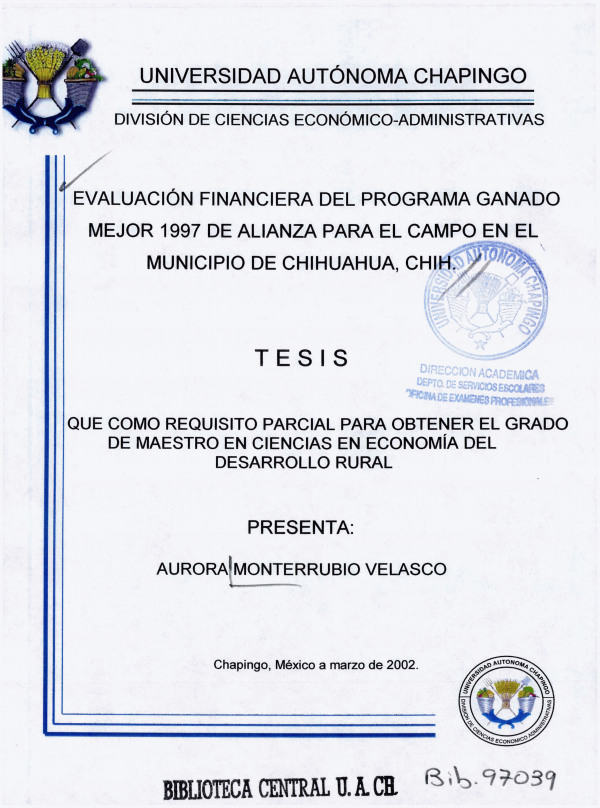 Evaluación financiera del programa Ganado Mejor 1997 de Alianza para el Campo en el municipio de Chihuahua, Chih. /por Aurora Monterrubio Velasco