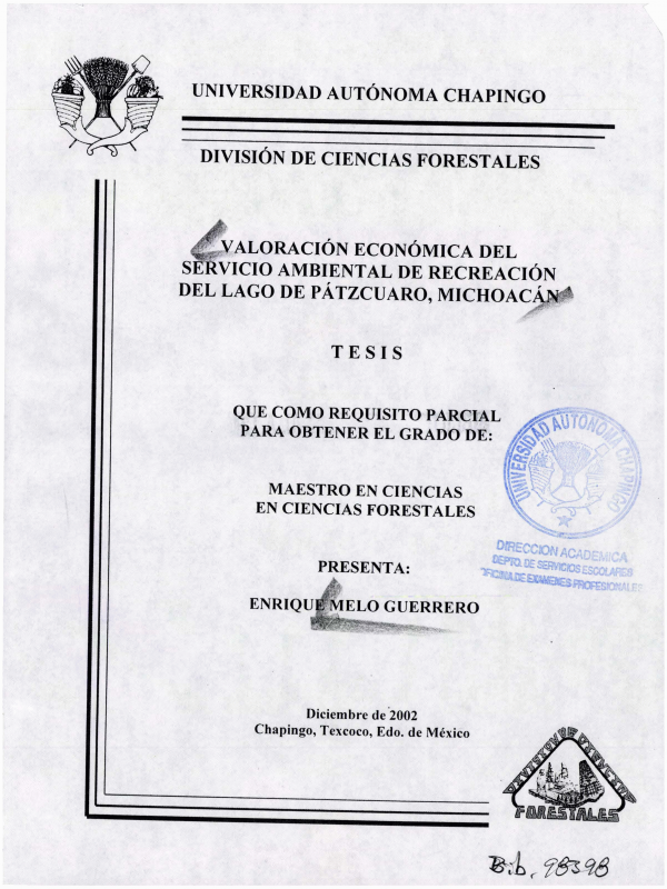 Valoración económica del servicio ambiental de recreación del Lago de Pátzcuaro, Michoacán /por Enrique Melo Guerrero