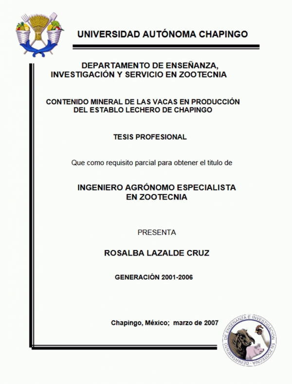 Contenido mineral de las vacas en producción del establo lechero en Chapingo / por Rosalba Lazalde Cruz;