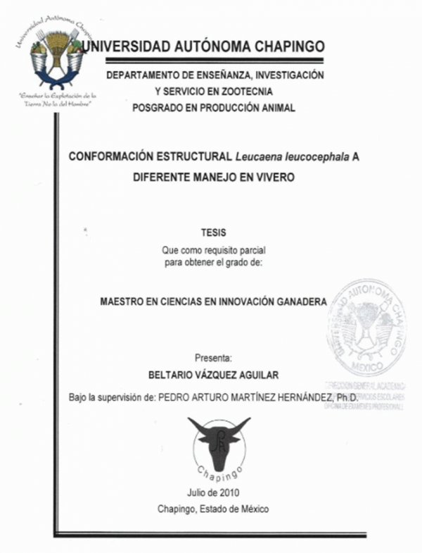Conformación estructural de Leucaena leucopcephala a diferente manejo en vivero /por Beltario Vázquez Aguilar; director Pedro Arturo Martínez Hernández