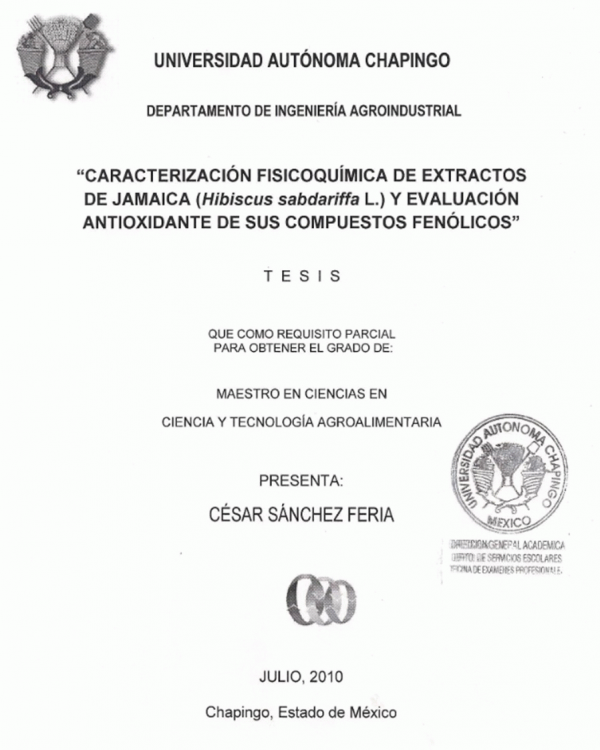 Caracterización fisicoquímica de extractos de jamaica (Hibiscus sadbariffa L.) y evaluación antioxidante de sus compuestos fenólogicos /por César Sánchez Feria; director David Rubio Hernández