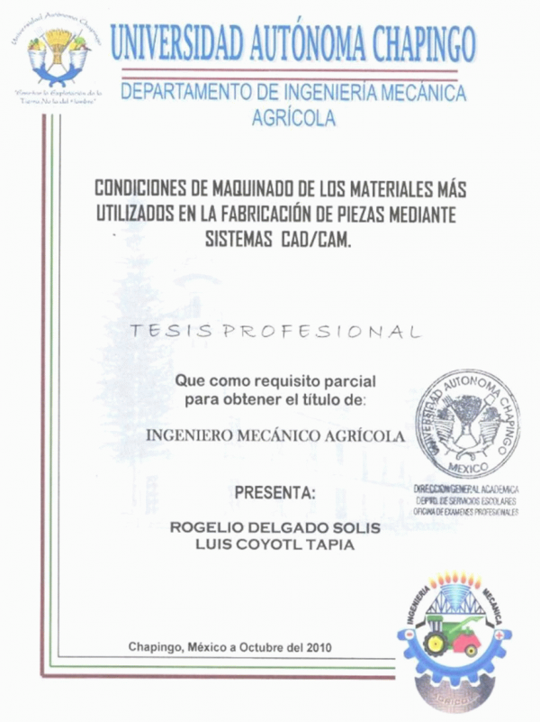 Condiciones de maquinado de los materiales más utilizados en la fabricación de piezas mediante sistemas CAD/CAM /por Rogelio Delgado Solis y Luís Coyotl Tapia; director Abraham Cortés Hernández