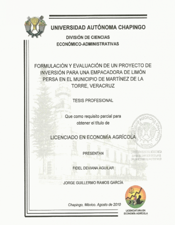 Formulación y evaluación de un proyecto de inversón para una empacadora de limón persa en el municipio de Martínez de la Torre, Veracruz /por Fidel Deviana Aguilar y Jorge Guillermo Ramos García; director de tesis Ignacio Caamal Cauich.