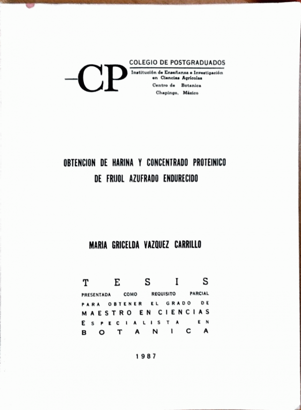 Obtención de harina y concentrado proteínico de frijol azufrado endurecido / María Gricelda Vázquez Carrillo by
