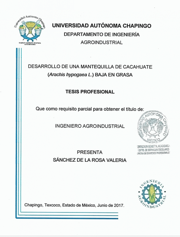 Desarrollo de una mantequilla de cacahuate (Arachis hypogaea L.) baja en grasa / Valeria Sánchez de la Rosa by