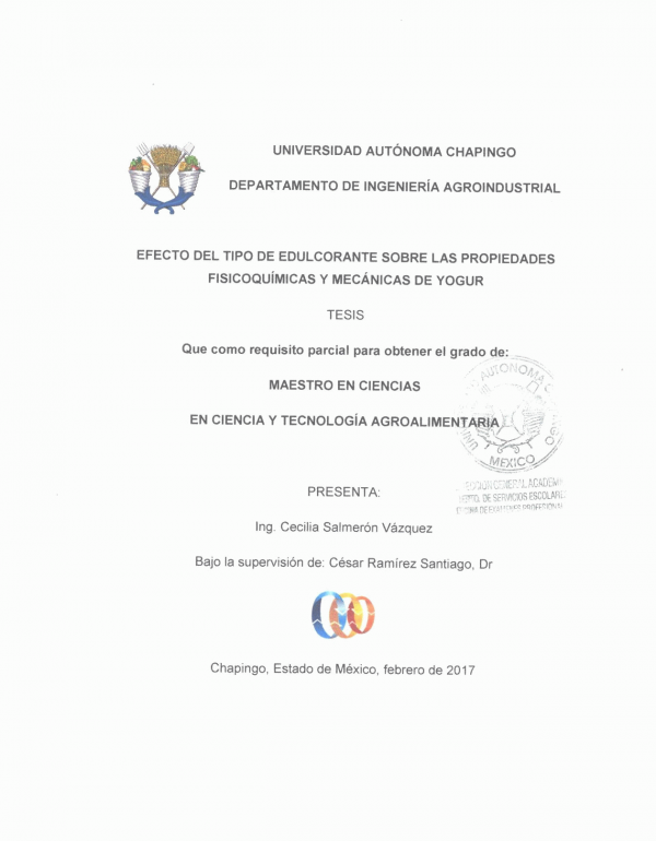 Efecto del tipo de edulcorante sobre las propiedades fisicoquímicas y mecánicas de yogur / Cecilia Salmerón Vázquez by