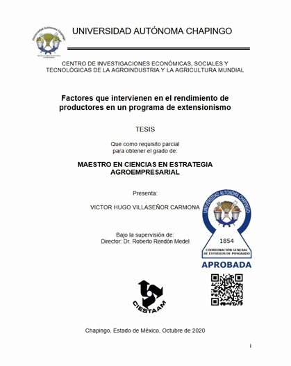 Dissertation note: Maestría en Ciencias en Estrategia Agroempresarial Universidad Autónoma Chapingo. Centro de Investigaciones Económicas, Sociales y Tecnológicas de la Agroindustria y la Agricultura Mundial, [2020]. Maestría