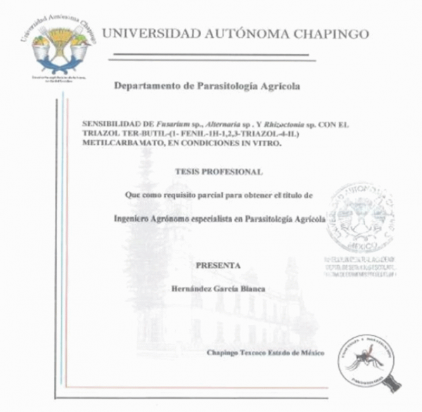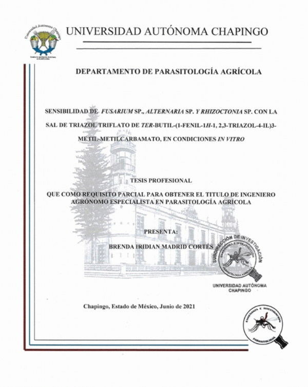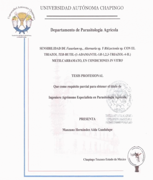 Sensiblidad de Fusarium sp., Alternaria sp. y Rhizoctonia sp. con el triazol ter-butil.,(1 adamantil 1 h-1,2,3-triazol-4-IL.) metilcarbamato, en condiciones in vitro / por Aida Guadalupe Manzano Hernández , director de tesis Santos Gerardo Leyva Mir. by