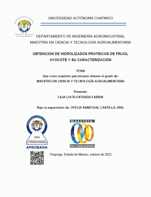 Obtención de hidrolizados proteicos de frijol ayocote y su caracterización / Lilia Lucia Estrada Fabián by